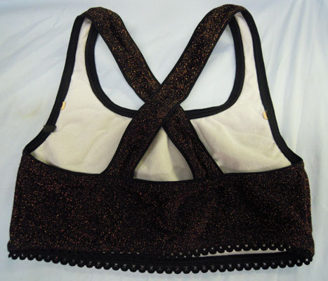 ビキニトップのみです!!サイズ表記:9M フィットネス&水着どちらにもご使用できますキラキラ素敵なラメ入り生地 背中のクロスのデザインがgood!アンダーにはさりげなくフリル付きゴムをつけてオシャレ感up!引掛けパットを付ける受け(ピコ)付き前身裏付き ※アウトレットのため汚れやタグ切れ等があるばあいがございますがご使用には問題ない商品です